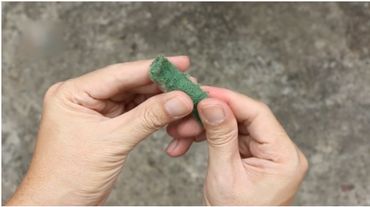 將其海綿上的那塊粗糙部分撕下來,